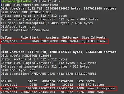 - Jakiteko zein partizio izan daiteke arazoaren sortzailea, aztertuko ditugu zein diren partizioa ere bere izenak agindu honekin: sudo fdisk -l. Nire kasuan hau bueltatu zidan: